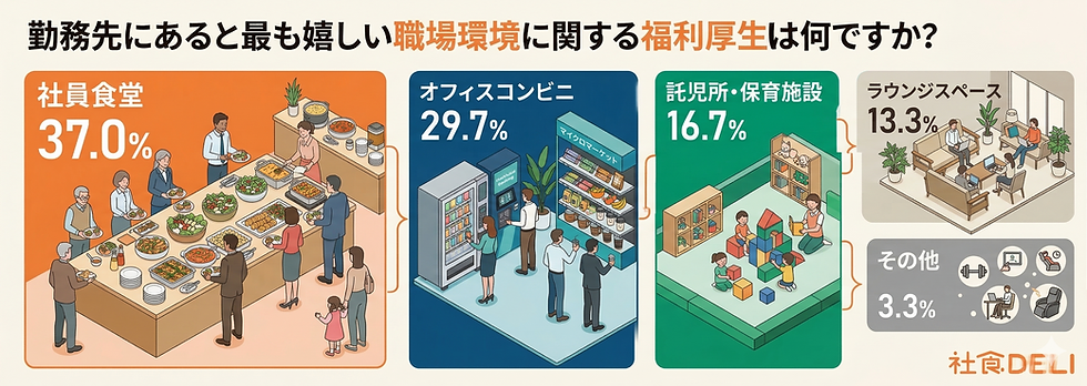 さらに、職場に欲しい福利厚生についての項目では1位が社員食堂という結果でした。